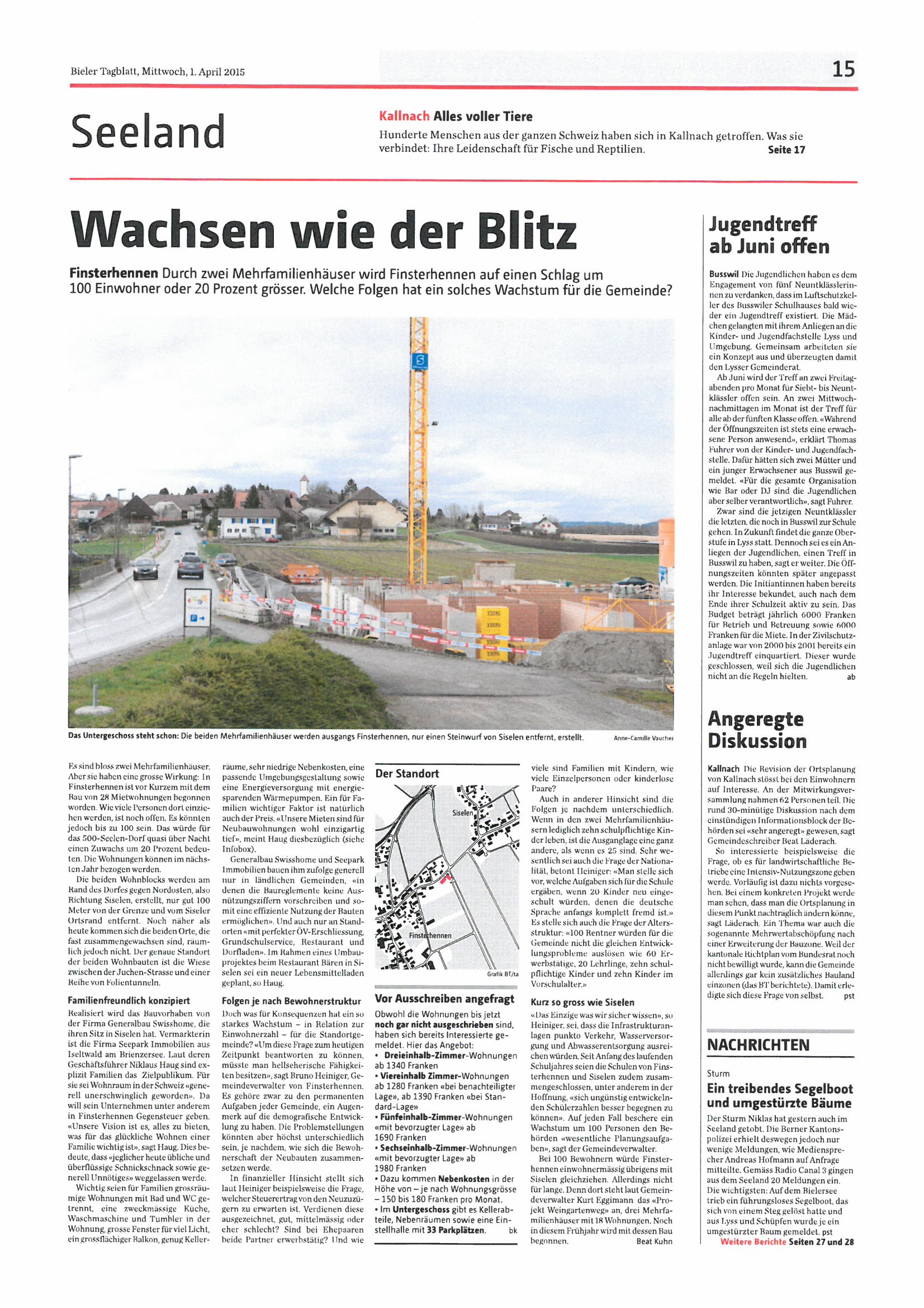 Zeitungsartikel Bieler Tagblatt vom 1. April 2015
